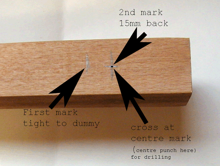 Now find the centre of the shaft width (19mm in from side) and make a cross at this location. This is where you will drill the 12mm diameter hole for the locking pin. It is worth making a punch mark at the centre of this mark using a bradawl, centre punch or nail, this will stop the drill bit wandering when you start to drill. If you have access to a pillar or bench drill use this with a 12mm diameter drill bit to drill the hole completely through the arm shaft. If you are using an electric drill ensure that you have the arms clamped in a vice or onto a bench. It helps to have a scrap piece of wood underneath the arm shaft so that when the drill bit comes through the shaft it does not break out the timber. Once the arm shafts are drilled replace them in the dummy body and drop in the locking pins and you are ready to go.